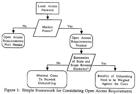 An analytical framework which might be useful for considering these questions is shown in Figure 1. Given the local exchange network and local transport markets it serves, open access requirements should be considered if the LEC holds substantial marke t power to hinder the development of competition. If this is not the case, then the market should support some degree of competition and no open access requirements are needed. For the case where open access requirements are necessary, the next issue is t o decide the extent to which unbundling is needed to open access to the network. When there are strong economies of scale and scope between the unbundled network elements, the process of network unbundling will make these economies unrealizable and therefore impose costs. To ensure that such a policy would be cost-effective, the benefits of the unbundled network components should be weighed against the lost economies arising from the unbundling process. Finally, if there are no large economies of s cale and scope between the unbundled elements, then the costs of the unbundling process are less of a policy concern (although the actual costs of unbundling still need to be considered).