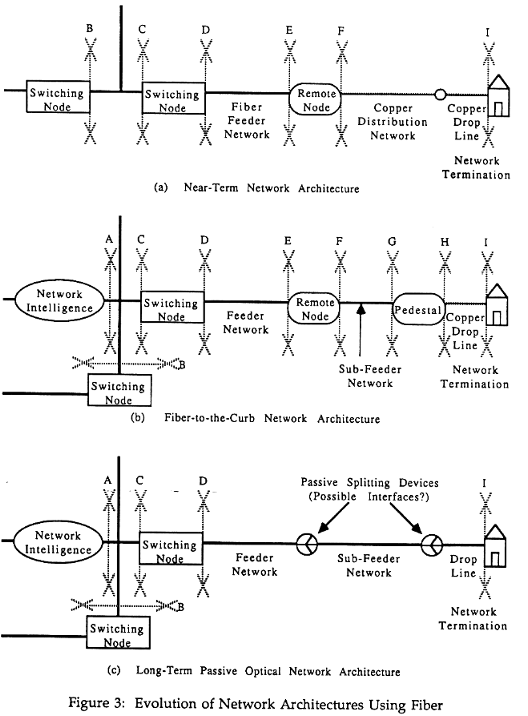 Finally, with the continuing rapid advance in optical transmission technologies, an unresolved issue of great interest is the fiber-based network architecture most suited for the subscriber loop. While the strategy of network evolution presented above is consistent with many forecasts, there have been a number of alternative approaches proposed for installing fiber in the subscriber loop that vary depending upon the services carried by the network. The results of this section clearly demonstrate how th e opportunities, and costs, for network unbundling can vary with network architectures. Thus, one would clearly expect both new and lost opportunities for low-cost network unbundling with each proposal.