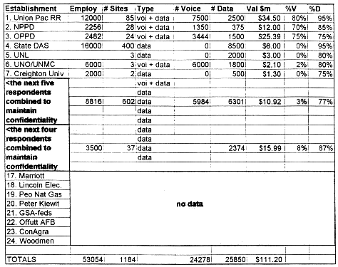 The second largest category was government. This included the state department of communication, a branch of the Division of Administrative Services (DAS), and the University of Nebraska system, which includes two campuses in Lincoln, the University of Nebraska Omaha, the University of Nebraska Medical Center, and the Peter Kiewit Conference Center. We did not attempt to count the state Educational Television Network (ETV) because of its status as a broadcast network. Unfortunately, we were unable to o btain information about the federal government network or the network at the Offutt Air Force Base. Federal government offices in the state utilize the FTS 2000 private network, but the GSA was unable to give us any useful information about its size in Ne braska. Each federal agency orders capacity from it independently, making information gathering most difficult. The military of course was concerned with the security implications.