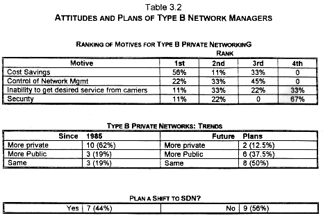 When asked to indicate "how [their] company's reliance on its Type B private network has changed since 1985," almost two thirds answered that they thought they had moved toward "more reliance on [their] private network." When asked about future trends, however, half (50%) said they expected things to remain at the same level. Of the remainder, 37.5% thought they would rely more on public networks and 12.5% thought they would rely more on private networks. Those who expected to rely more on private net works were also those with the largest investments in privately owned transmission facilities.