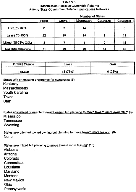 The predominant future direction seems to be toward leasing rather than ownership. However, as was the case with the Nebraska Type B networks, systems which have already made a commitment to ownership are more likely to continue that trend. Eighteen of thirty responding states said that they would move toward leasing rather than owning in the future. Six said they would move toward ownership. Six said they would maintain a mix of owned and leased facilities. Many states cited the budget constraints of the past few years as the reasons for favoring leasing over ownership.