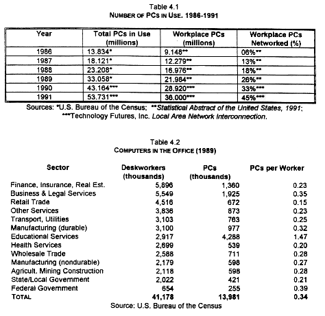 Table 4.2 lists the number of desk jobs in various sectors and the degree of PC penetration. Whereas in 1984 there was one PC in the office for every 18 desk workers, in 1989 there was one for every three workers. By 1996, one estimate says there will be 9 computers in the office for every 10 deskworkers. TF, Inc., p. 41