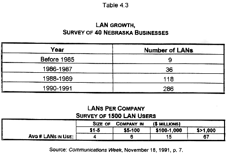 Following closely behind the spread of PCs has been a growth in networked or distributed computing. Bellcore estimated that the number of LANs grew from 20,000 in 1983 to 800,000 in 1988. Dataquest estimates show that from 1989 to 1993 there will be a 24% CAGR in unit sales and a 39.5% CAGR in installed base. A conservative estimate of the number of LANs in 1991 would be 2.5 million. cite TF Inc., p. 23-24 In Nebraska, however, we found a growth rate for LANs that greatly exceeded the national estimate s.
