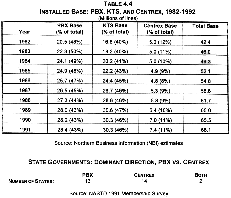 Table 4.5 shows that of 29 states responding, 13 said that PBX would be the dominant direction in the future, 14 said that Centrex would be the dominant direction, and two states said that they would be expected to play an equal role.
