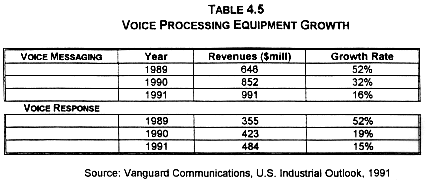 While growth rates for PBXs and Key systems are flat, other developments indicate that Type A private networking will continue to play a major role in the voice arena, and may even expand dramatically. Features such as voice messaging, call accounting systems, and automatic call distribution systems (ACD) further blur the line between voice and data, and give managers important new functions which are critical to the way office communications take place. Voice messaging and Voice Response sales grew by 15 and 16% in 1991, respectively, despite a recession which slowed the growth in PBX, KTS and Centrex lines to less than 1 percent. (See Table 4.5) The introduction of wireless data communications and wireless PBXs should stimulate a new round of private ly-developed CPE purchases as managers search for new on-premise networking solutions. Here again, advanced wireless features will be available to users via CPE purchases using unlicensed frequencies long before public carriers bring PCS or similar servic es to the market.